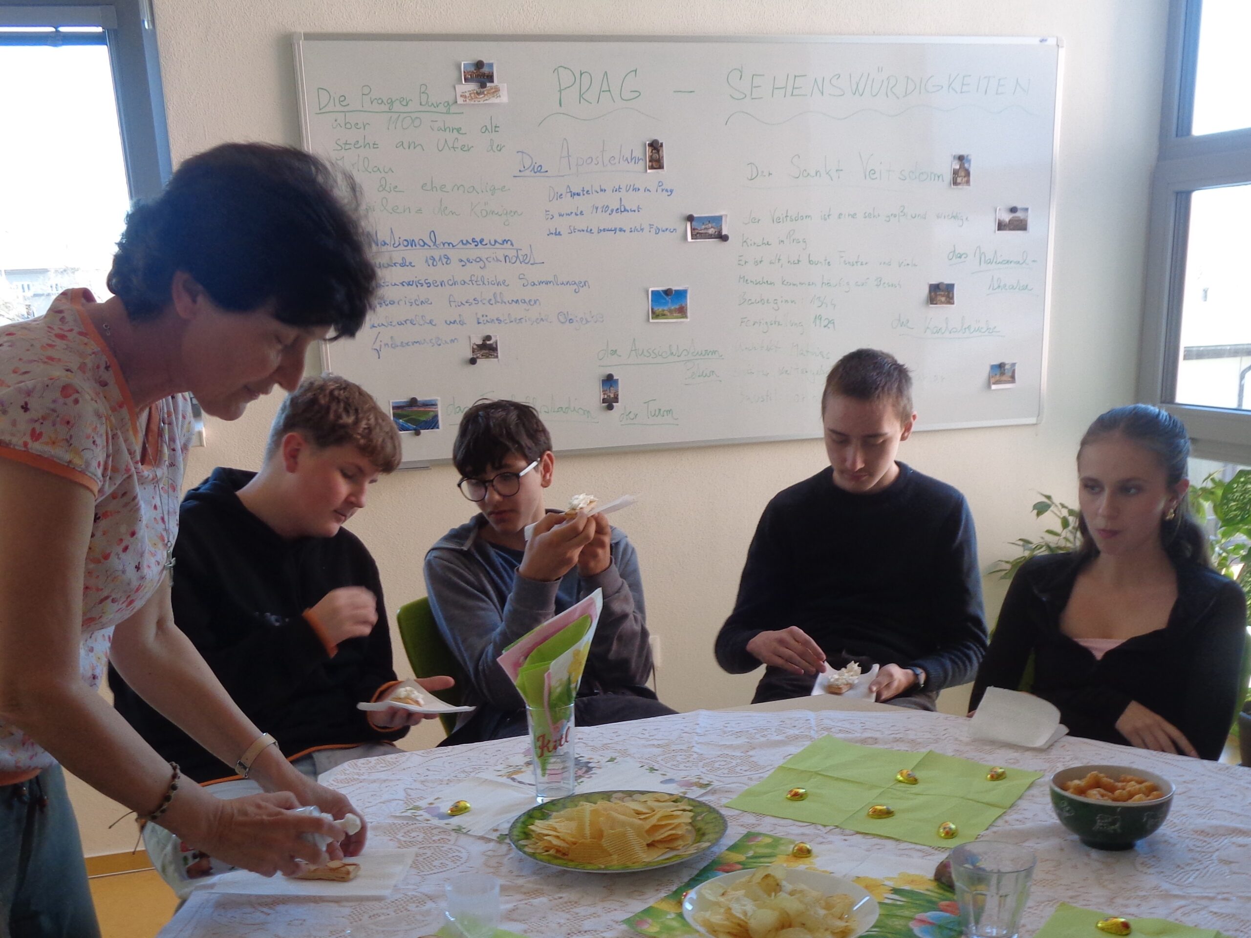 Největší výzvou je poslední hodina etické výchovy v 9.A. Ovšem tím myslím čas od 15:10 – 15:55 hod. Děs, na to není co říct 🙂 . Ale tento týden, vzhledem k tomu, že v pátek 12.4. a v pondělí 15.4. dělají přijímačky na střední školu, bylo jasné, že do poslední hodiny vydrží jen hrstka statečných. Nakonec jich bylo opravdu jen rovných deset z dvaceti čtyř. Rozhodla jsem se, že udělám překvapení ve formě hostiny. To jste měli vidět tu radost, když spatřili dobroty na stole! Celá hodina byla velmi uvolněná, povídací a milá.
